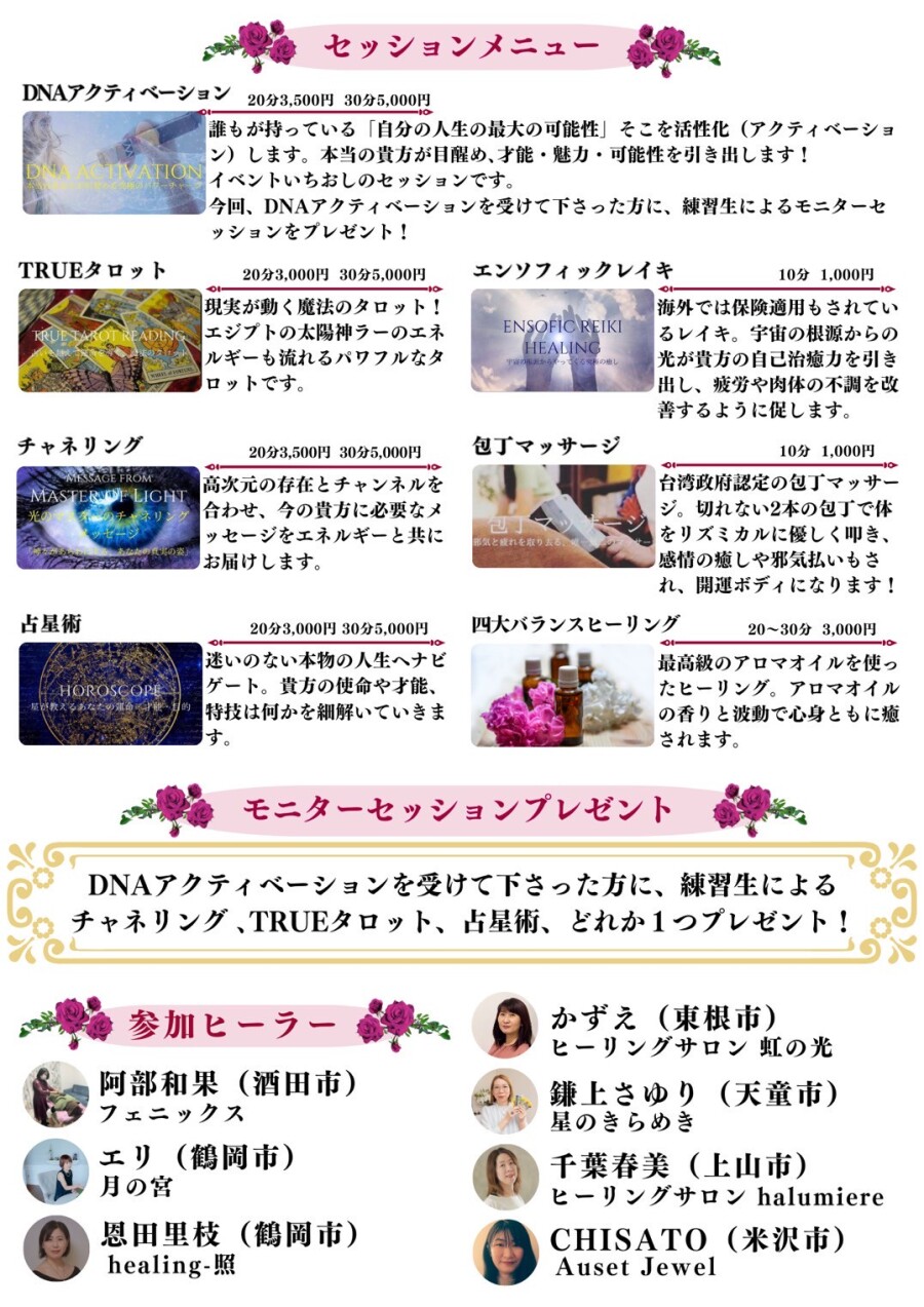 ビジネス、恋愛、人間関係など、それぞれ得意な分野があるので、当日質問されたいことをお伝えください。